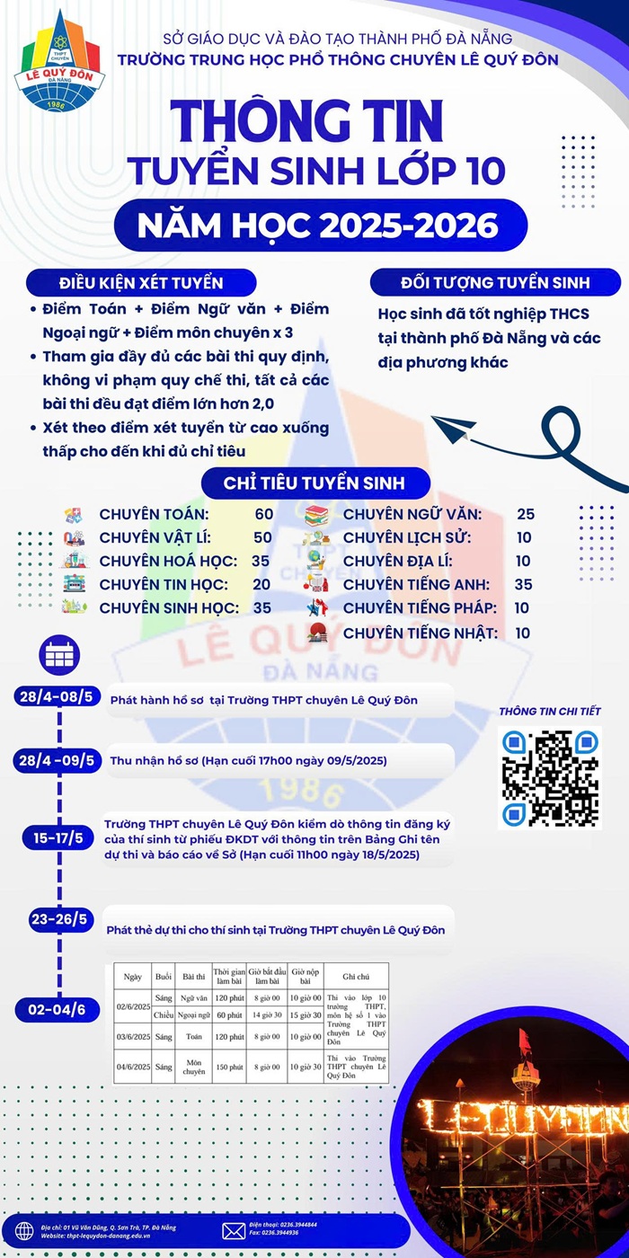 Thực hiện theo Quyết định số 610/QĐ-UBND ngày 24 tháng 02 năm 2025 của UBND thành phố Đà Nẵng, Trường trung học phổ thông (THPT) chuyên Lê Quý Đôn thông báo tuyển sinh vào lớp 10 năm học 2025-2026 như sau:
